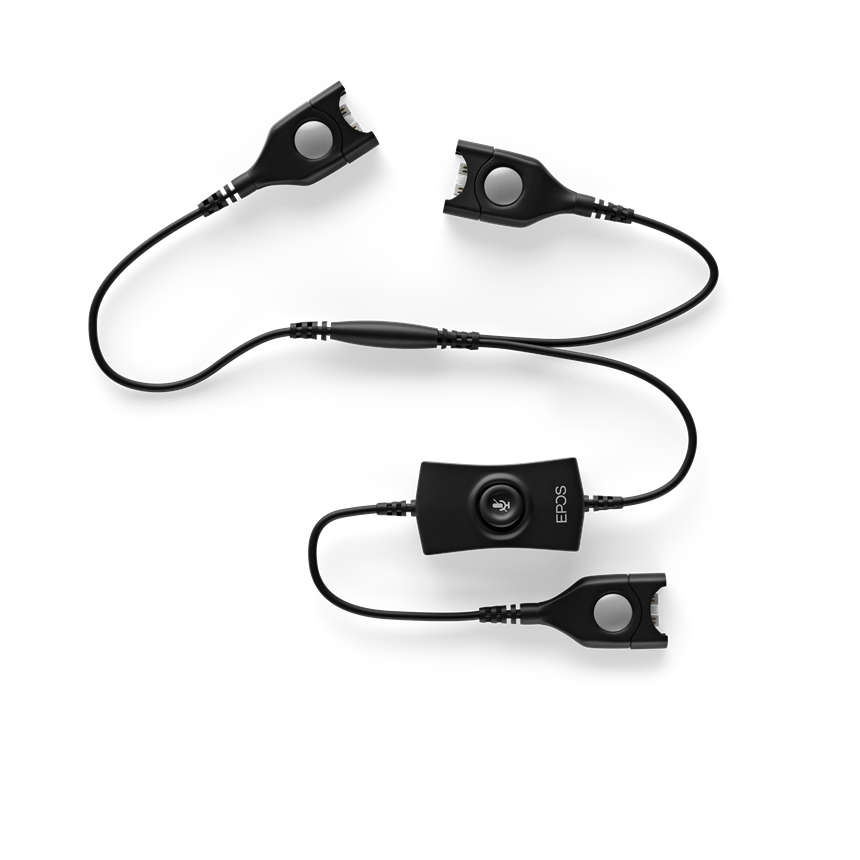 Y 字型ケーブルに2つのEDコネクタ接続の業務用ヘッドセットを接続する事ができ、分岐側の一方は送受話が可能です。もう一方はモニタリングをされる方の為に受話が可能ですが、マイクミュートスイッチ付(マイクの ON/OFF 切り替えスイッチ)を使う事で送話も可能になります。